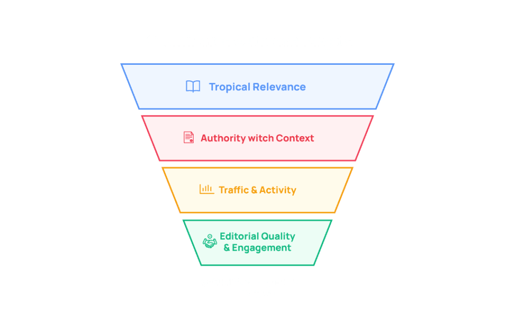 Qualification: filter that list based on topical alignment, authority (with context), traffic signals, and editorial quality to remove low-value sites early.