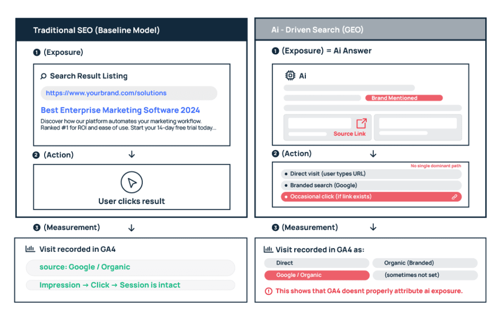 With AI sitting on top of every search interface now – from our traditional search engines like Google and Bing to LLMs like ChatGPT, Perplexity, Gemini, and Claude – your brand can appear in answers without a clickable URL attached. These are zero-click mentions. They influence awareness and perception, but they don’t generate measurable sessions.