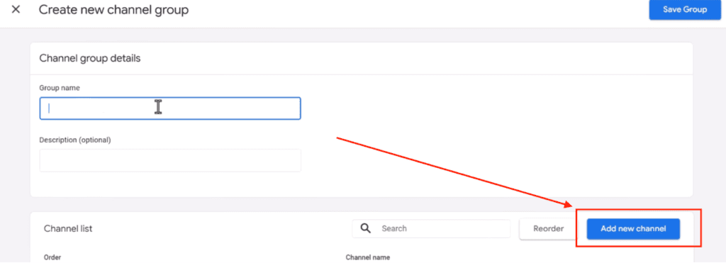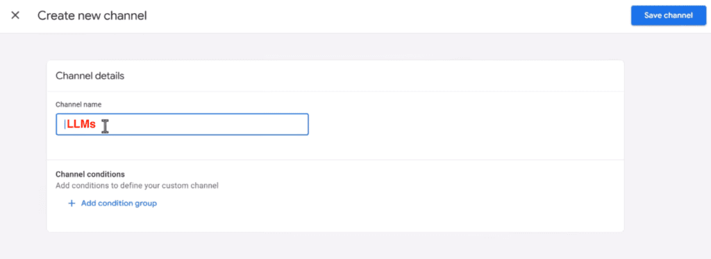 Create a new channel group and name the group AI traffic channel – whatever works for you. Then click “add new channel”.