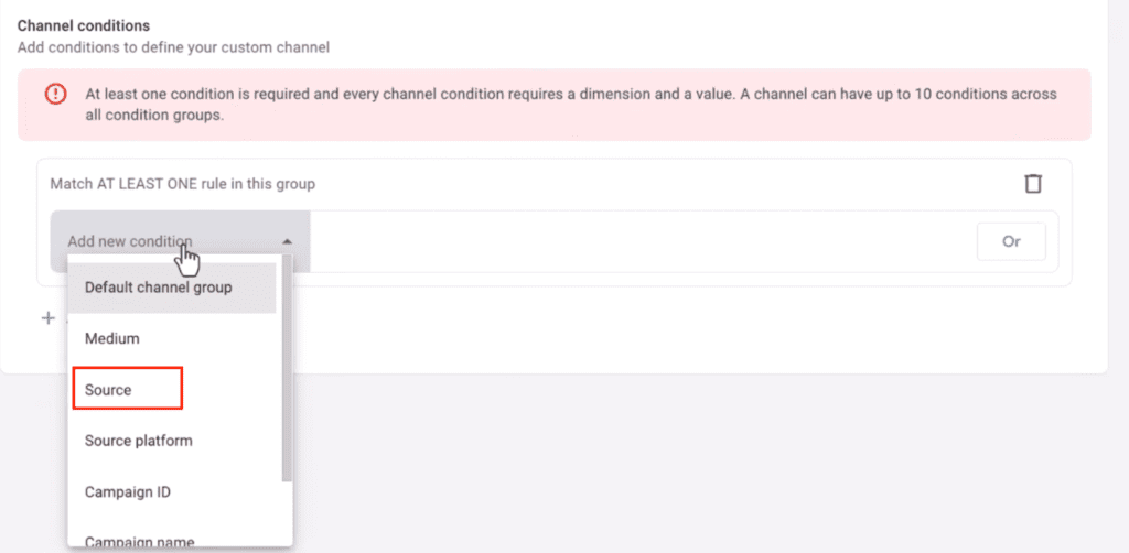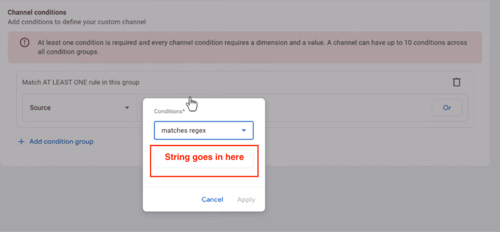 - Set the channel condition to “Source → matches regex.” Add a regex string that captures major AI domains.