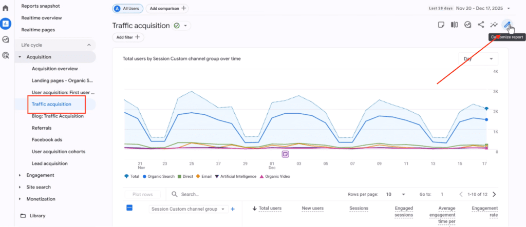 - Use the Traffic Acquisition report to view AI traffic. Switch the primary dimension to your AI Traffic Channel Group to see AI visits alongside channels like Organic Search, Paid Search, and Direct.