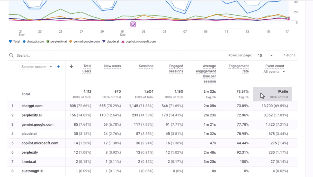 - Create a dedicated AI traffic report for deeper analysis. Filter the report by your AI channel group and use Session source to see which LLMs are sending traffic (ChatGPT vs Perplexity vs Gemini).