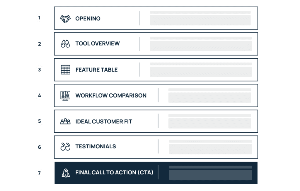 - Focus on real decision factors like pricing, integrations, onboarding, and ideal customer fit rather than listing every feature.