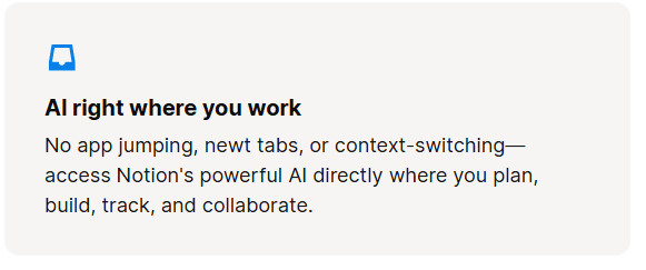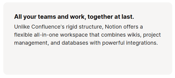 The Notion vs Confluence comparison page shows workflow differences rather than just listing features. These sections explain how Notion reduces context switching by combining tools in one workspace. This helps readers understand the practical impact on daily work, not just the feature set.