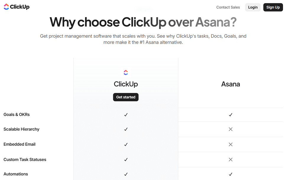 The ClickUp vs Asana comparison page is a good example of a well-designed feature table. It uses clear decision categories, icons and visual formatting to improve scannability, and minimal text so buyers can quickly spot the most important differences between the tools.