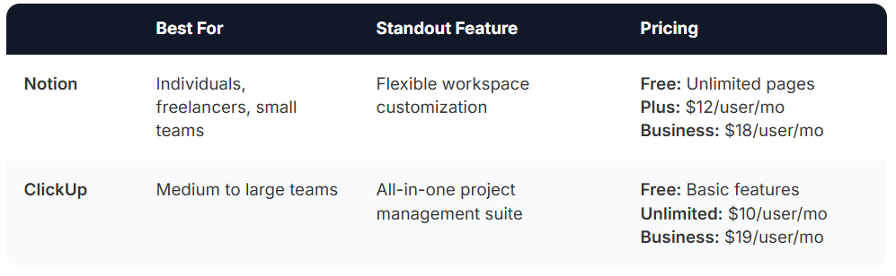 The Notion vs ClickUp comparison is a strong example of clearly defining ideal customer fit. By stating that Notion works best for individuals and small teams, while ClickUp is designed for larger teams needing structured project management, the page helps buyers quickly determine which tool aligns with their team size and workflow needs.