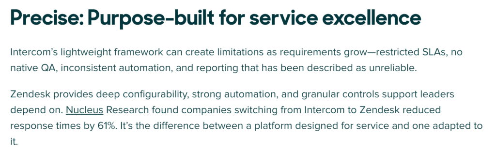 Where you have real numbers to back your claims up, use them, as Zendesk does in their comparison page with Intercom, citing research on response time reduction for those switching from their competitor.