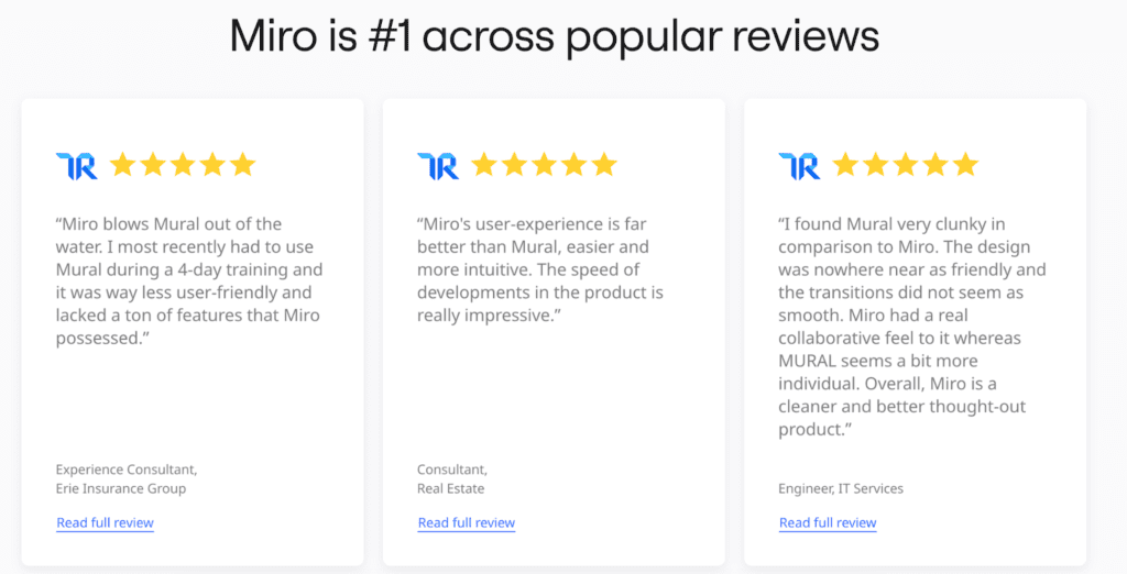 Quotes from customers who switched from the competitor are especially powerful, since they provide direct evidence of why someone chose your product. When possible, include results tied to real outcomes such as faster onboarding, improved reporting visibility, or operational efficiency. For example, Miro has pulled detailed TrustRadius reviews that compare them to competitor Mural: