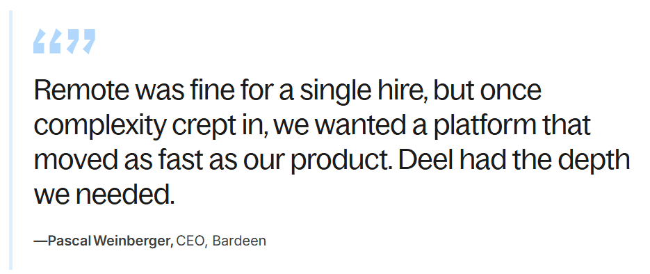 The Deel vs Remote comparison page uses testimonials to reinforce the comparison with real customer experiences. Quotes from companies that switched tools help illustrate how the differences between the platforms impact real operational needs as teams grow.