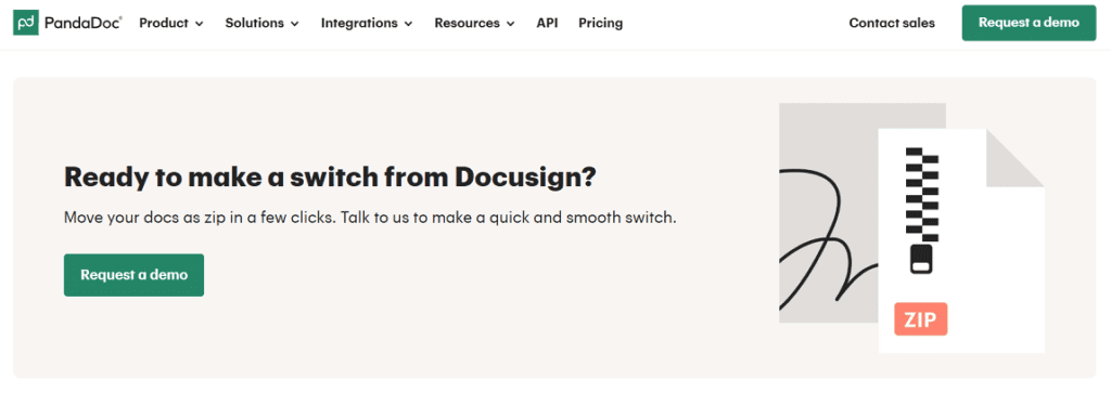 PandaDoc’s CTA follows the same principle of matching the next step to the buyer’s readiness. Right before the call-to-action, the page reinforces PandaDoc’s advantage by highlighting how easy it is to switch from DocuSign, reducing the perceived friction of migration. The CTA “Request a demo” then guides high-intent visitors toward the next step in the decision process, so teams can see the platform in action before committing.