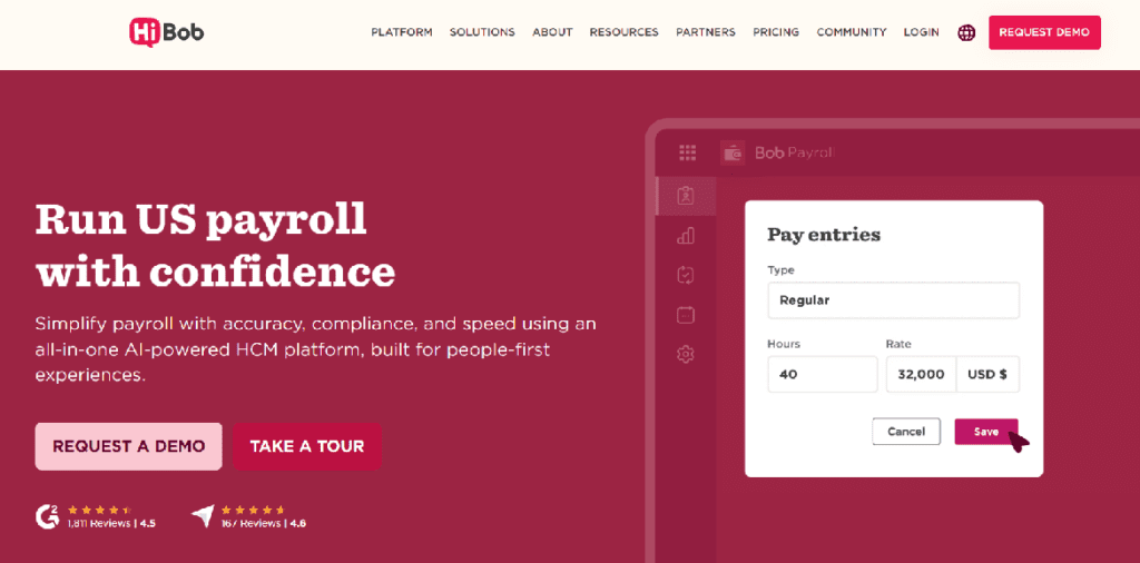 HiBob’s payroll feature pages are a strong example of adding context, constraints, and tradeoffs directly into the page structure. Instead of presenting “Payroll” as a single, universal feature, HiBob splits it into clearly defined, location-specific pages like UK Payroll and US Payroll. Each page makes it clear where the feature applies.