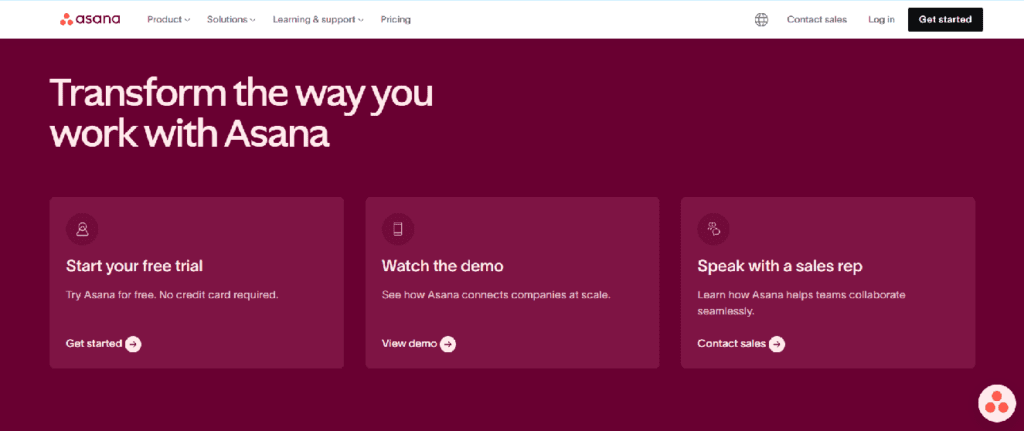 Asana’s project management feature page shows how to handle CTAs with intent. Instead of forcing every visitor down the same path, the page presents three clear options at the bottom: start a free trial, watch a demo, or speak with a sales rep. Each CTA maps to a different stage of buyer readiness: hands-on evaluation, low-commitment exploration, or high-touch sales conversation. This makes the next step feel logical rather than pushy, and allows their visitors to move forward in a way that matches how they want to evaluate the product.