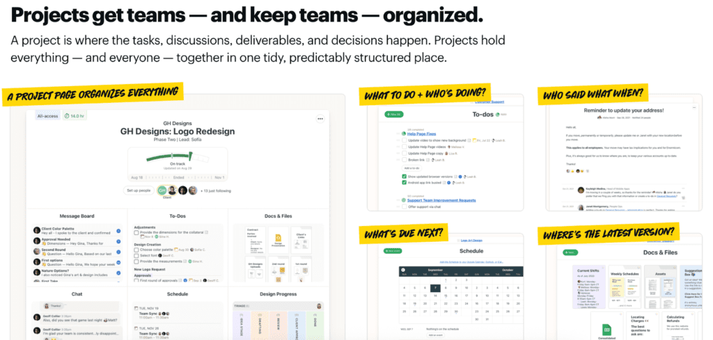 Basecamp’s projects feature page leads with a clear promise in the headline: projects are what keep teams organized. The supporting sentence explains why by defining a project as the single place where tasks, discussions, deliverables, and decisions live together. Instead of abstract claims, the visual shows exactly how that organization looks in practice: one project containing to-dos, message boards, schedules, and files, alongside callouts that answer common team questions like what to do, who’s responsible, what’s next, and where the latest version lives. By showing how everything related to a project is grouped in one structured space, the page makes the value of Projects immediately understandable