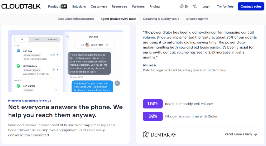 CloudTalk’s feature page is also a good example, as they add statistics and real customer quotes pulled directly from customer stories. Instead of relying on generic benefit statements, the page highlights concrete outcomes. By grounding each claim in a specific result and a real customer voice, the page reduces ambiguity and builds trust. Prospects don’t have to imagine whether the feature works; they can see evidence of how it performs in real teams. This kind of lightweight proof invites buyers to picture similar results in their own business, without forcing them to dig into a full case study before they’re ready.