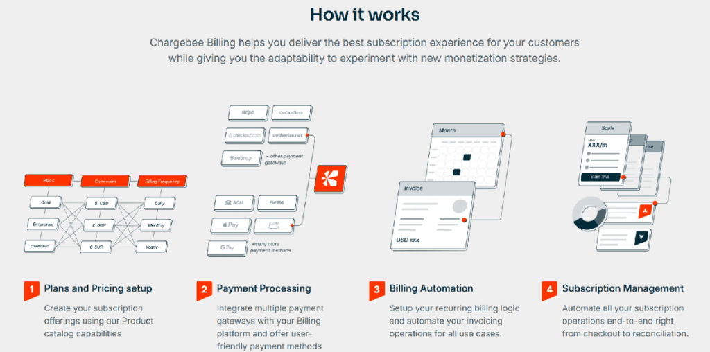 Chargebee’s subscription billing feature page shows what actually happens when you use the product. The visuals walk the reader through a simple sequence: you create billing plans, connect payments, then let billing and subscriptions run automatically. Each step is packed with useful detail—you can see things like multiple currencies, different payment processors, and real configuration options—so the reader understands the scope without reading long explanations. By presenting the flow in a clear order, the page helps buyers grasp how Chargebee handles subscription billing before worrying about setup or feature lists. It makes a complex system feel easy to understand at a glance, which is exactly what this part of the page needs to do.