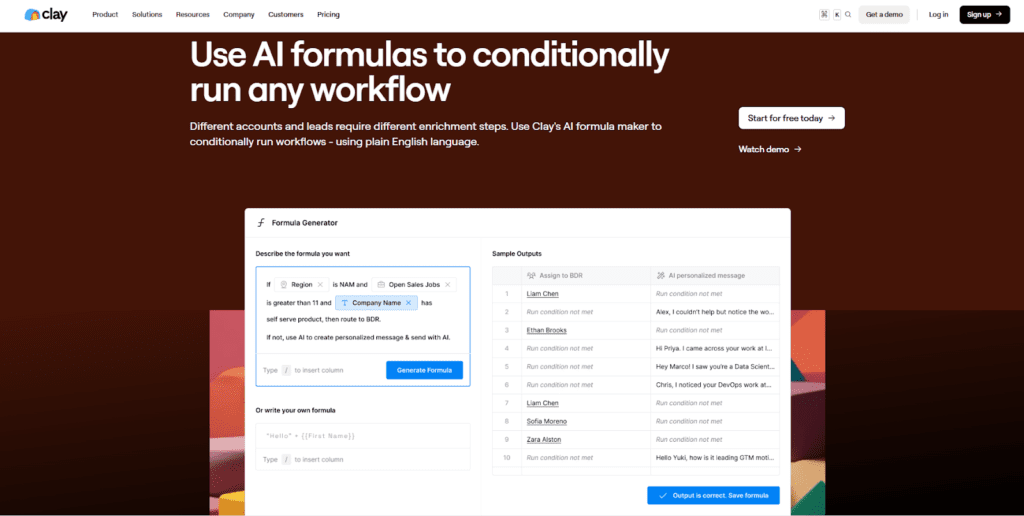 Clay’s AI formula generator feature page is an example of this principle in action. Instead of describing conditional workflows abstractly, it shows the actual interface where users define logic, preview outcomes, and confirm results. The side-by-side layout turns a complex capability into something understandable.
