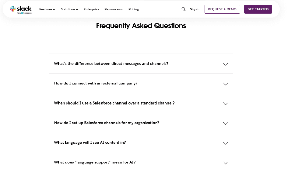 Slack’s Channels feature page is a good example of using FAQs deliberately and with restraint. The main page stays focused on explaining what channels are and why they matter for organizing work and communication. Once that foundation is clear, the FAQ section steps in to answer predictable follow-up questions that naturally come up from that narrative—such as how channels work for internal teams versus external partners, how they’re used with customers, and how channels connect with tools like Salesforce.