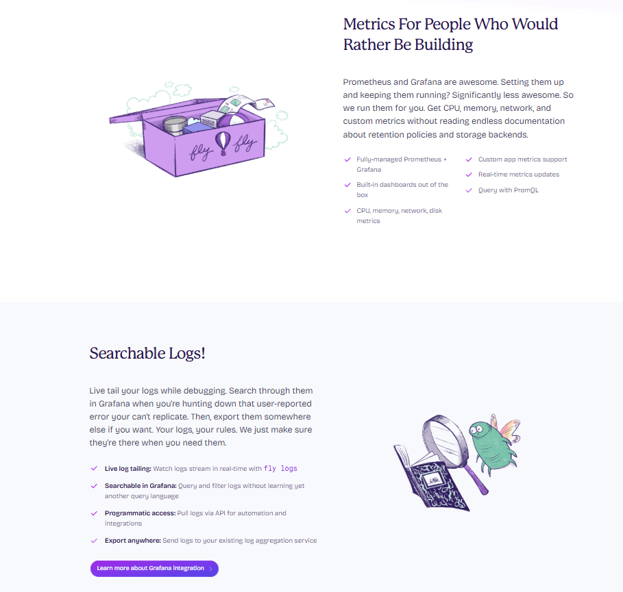 Fly.io’s monitoring page uses short paragraphs, and generous spacing to make each idea easy to absorb. Content is broken into distinct sections that stand on their own, so a buyer can skim, pause on a single block, and still understand the core value being communicated.