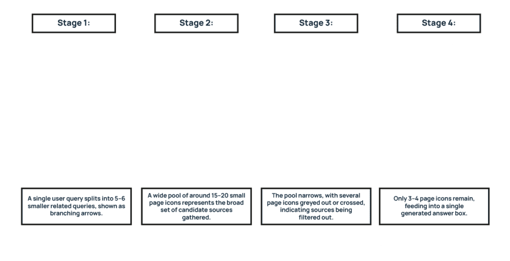 - The user’s prompt is then expanded into related queries and subtopics (a process called query fanout)